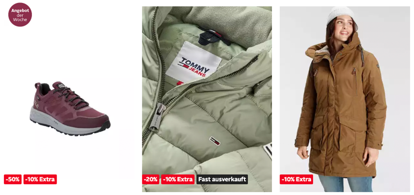 Zur Auswahl stehen euch auf der Aktionsseite über 2.200 verschiedene Produkte für Damen, Herren und Kids. Auf der Aktionsseite bekommt ihr eine Vielzahl an Oberteilen, Hosen und Jacken sowie viele Schuhen.