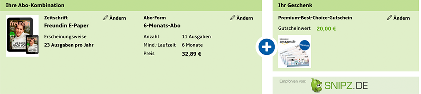 Bei Hobby+Freizeit gibt es gerade das Halbjahresabo mit 11 Ausgaben der Zeitschrift Freundin als E-Paper für 32,89€ und dazu Prämien im Wert von bis zu 25€.