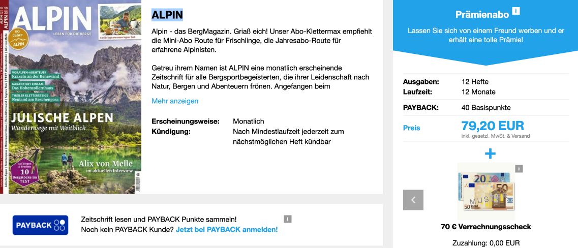 12 Ausgaben ALPIN für nur 79,20€ und dazu 70€ Verrechnunsscheck als Prämie