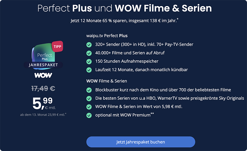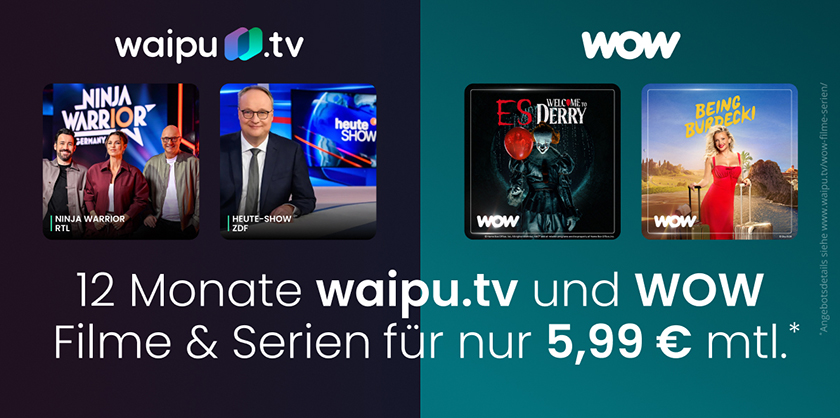 12 Monate waipu.tv Perfect Plus mit über 300 Sendern + WOW Filme & Serien für 5,99€ mtl.