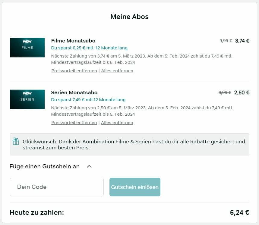 Damit bekommt ihr bei WOW 12 Monate lang das Filme- und Serienpaket für zusammen nur 6,24€ mtl. Ihr spart satte 13,77€ pro Monat!