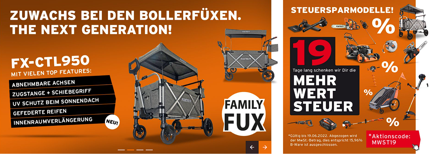 Im Fuxtec Onlineshop erhaltet ihr 19 Tage die Mehrwertsteuer geschenkt!