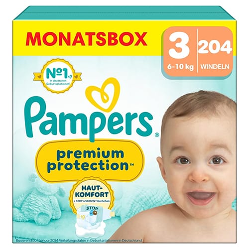 Bei Amazon bekommt ihr zur Zeit die Pampers Premium Protection Windeln in Größe 5 im 204er-Paket für nur 38,20€ inkl. Prime-Versand.