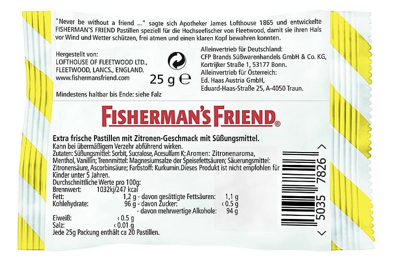 - OHNE ZUCKER UND VEGAN: Fisherman’s Friend Pastillen gibt es in verschiedenen Sorten. Die Bonbons sind zuckerfrei, vegan und enthalten keine künstlichen Farb- oder Konservierungsstoffe