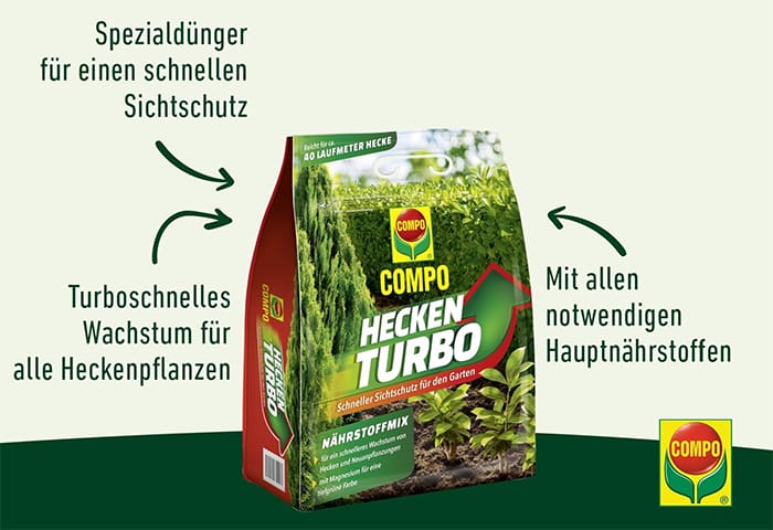 - COMPO Heckenturbo für schnelles Wachstum: Abgestimmter Nährstoffmix versorgt Hecken mit wichtigsten Hauptnährstoffen, extra Magnesium sorgt für Blattgrünbildung und vermindert Braunfärbungen