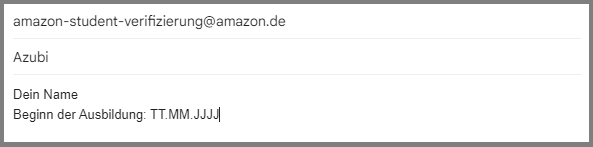 Falls ihr keine Hochschul-E-mail-Adresse habt, schickt ihr eine E-Mail an amazon-student-verifizierung@amazon.de, die ungefähr so aussehen muss: