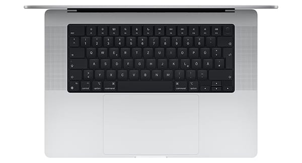 - Drei Thunderbolt 4 Anschlüsse, HDMI Anschluss, SDXC Kartensteckplatz, Kopfhöreranschluss, MagSafe Ladeanschluss