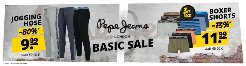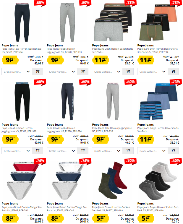 Ihr findet auf der Aktionsseite eine große Auswahl an Jogginghosen, Boxershorts und ein paar andere Klamotten von Pepe Jeans.