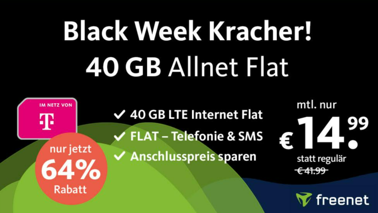 Freenet zaubert zum Black Friday einen absoluten Kracher aus dem Hut: Ihr könnt euch heute die freenet 40 GB green LTE Allnet Flat im Telekom-Netz für nur 14,99€ monatlich sichern.