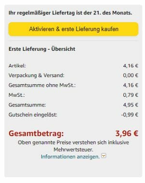 Hinweis: Aktiviert zum einen den 5% Rabattgutschein per Klick auf der Produktseite und bestellt über die Spar-Abo Option. Das Spar-Abo könnt ihr nach der ersten Lieferung in eurem Kundenkonto unter „Spar-Abo verwalten“ kündigen oder das Lieferintervall ändern.