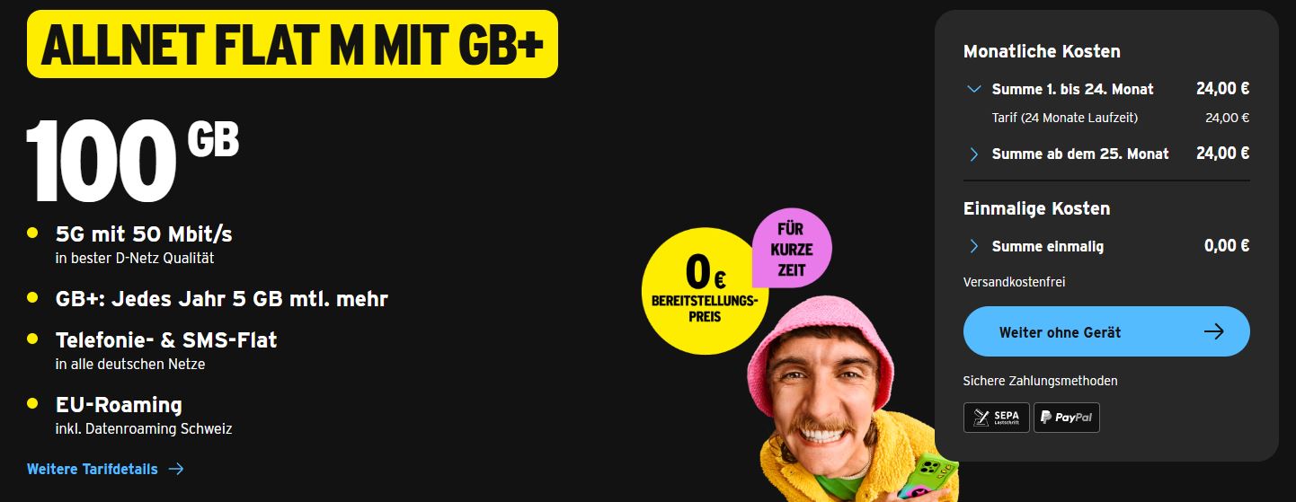 Wollt ihr den Tarif auf die 5G Option mit 100 Mbit/s upgraden, dann könnt ihr dies jederzeit aktivieren bzw. auch wieder deaktivieren und zahlt für die 5G Option lediglich 3€ mehr im Monat.