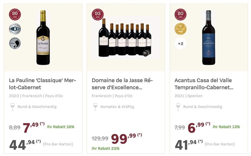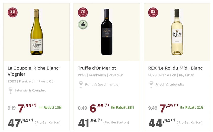 Auf der Aktionsseite bekommt ihr neben deutschen Weinen natürlich auch viele edle Tropfen aus aller Welt. Zur Auswahl stehen euch verschiedene Rot-, Weiß- und Roséweine sowie ein paar Schaumweine.