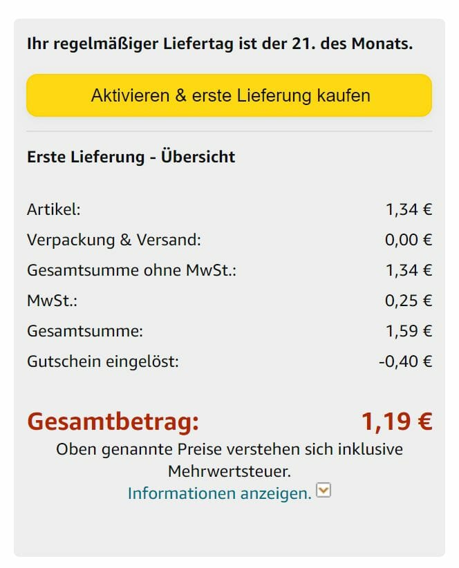 Hinweis: Aktiviert zum einen den 15% Rabattgutschein per Klick auf der Produktseite und bestellt über die Spar-Abo Option. Das Spar-Abo könnt ihr nach der ersten Lieferung in eurem Kundenkonto unter „Spar-Abo verwalten“ kündigen oder das Lieferintervall ändern.