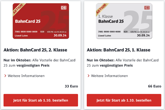 Im gesamten Oktober gibt es die BahnCard 25 als Jahresabo bereits für 33€ in der 2. Klasse und für 66€ in der 1. Klasse.