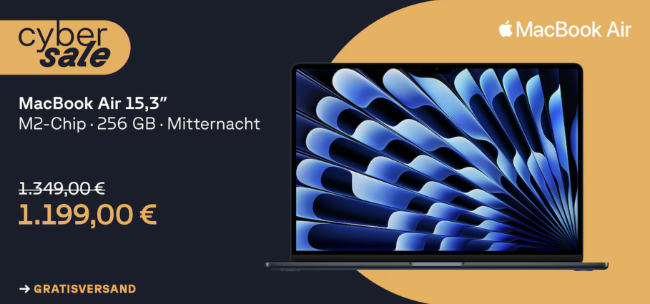 Im Cyberport CyberSale gibt es heute das Apple MacBook Air in der Farbe Mitternacht als 15,3 Zoll Variante mit M2 Chip für 1.199€ inkl. Versand.