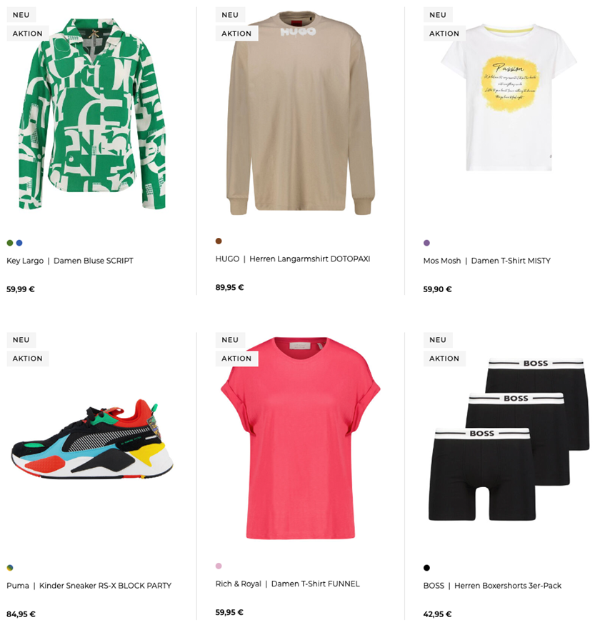 Mit von der Partie ist neben Oberbekleidung, Hosen und Jacken auch einiges an Unterwäsche für Damen und Herren. Zur Auswahl stehen euch auf der Aktionsseite über 6.900 verschiedene Artikel namhafter Hersteller, wie z.B. BOSS, Calvin Klein, Gant, HUGO, Levi’s, oder Polo Ralph Lauren.