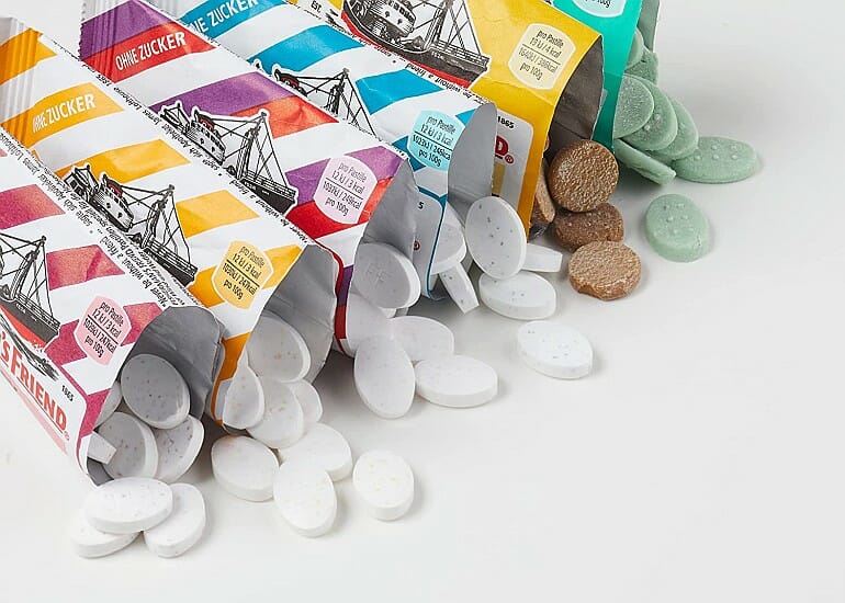 • 12 verschiedene Sorten: 9x zuckerfrei (Mint, Cherry, Spearmint, Lemon, Raspberry, Salmiak, Tropical, Beeren-Mix, Eucalyptus) sowie Mint, Anis und Eucalyptus mit Zucker
