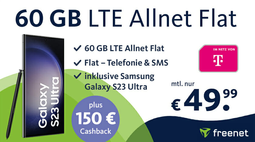 freenet Telekom Allnet Flat 60 GB für 49,99€ mtl. + Samsung S23 Ultra für 99,99€ + 150€ Cashback
