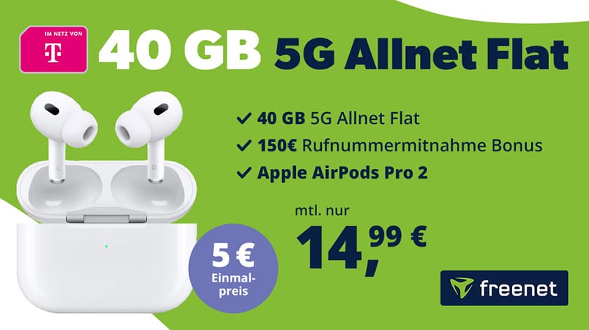 freenet Telekom Allnet Flat mit 40 GB für mtl. 14,99€ + AirPods Pro 2. Gen. für 5€ + 150€ Bonus