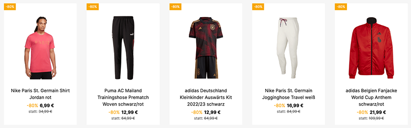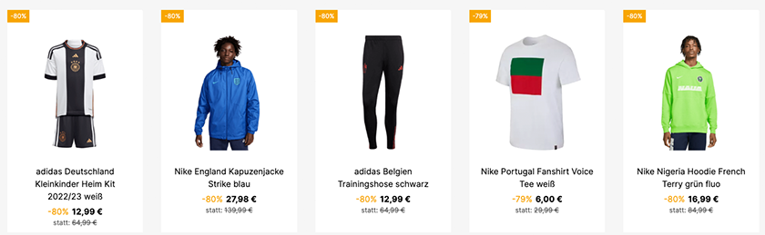 Im Angebot sind auf der Aktionsseite über 520 verschiednen Produkte, wie beispielsweise Trikots, Jacken, Shorts und vieles mehr von deinem Lieblingsverein.