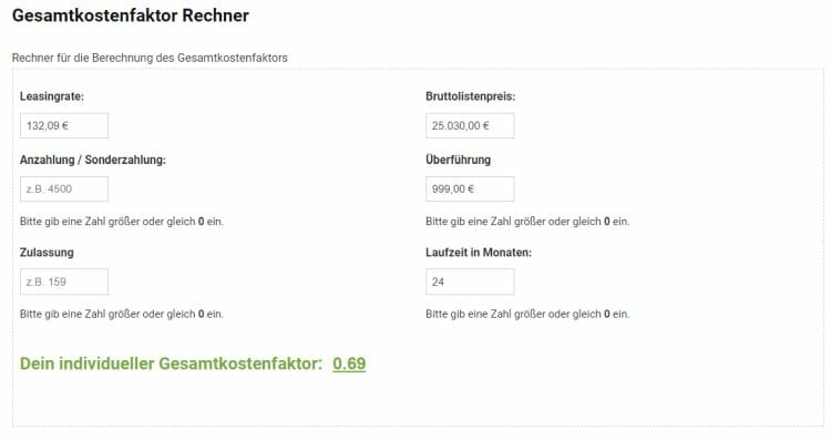 Leasingmarkt gibt es Leasingfaktor mit 0,53 an, allerdings sind die hier Überführungskosten noch nicht mit einbezogen. Daher habe ich mal den Gesamtkostenfaktor ermittelt – dieser liegt bei 0,69.