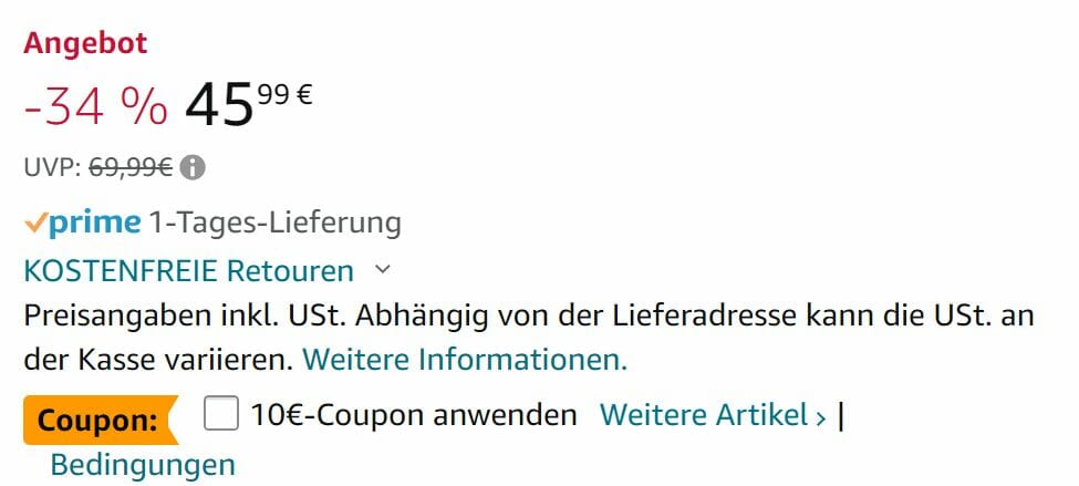 Um auf den Preis zu kommen, nutzt ihr bei der Bestellung den 10€ Klick-Coupon auf der Artikelseite.