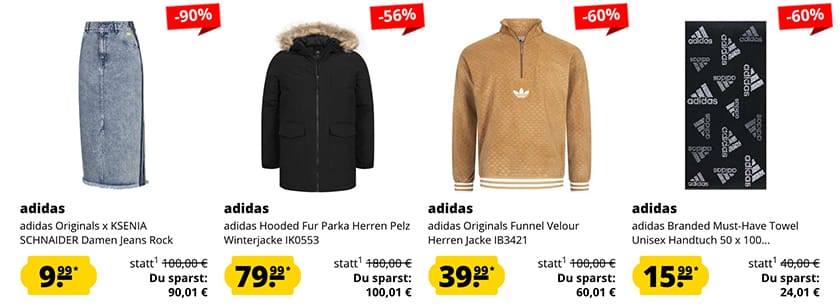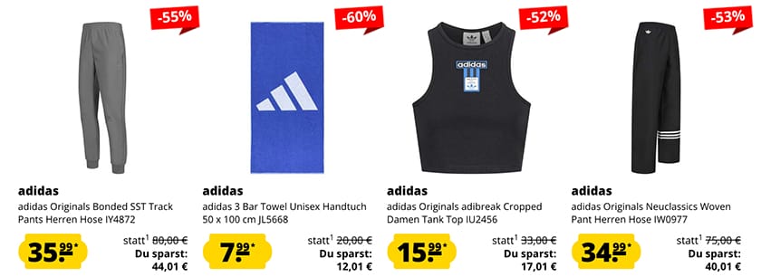 Wenn ihr gerne Adidas Klamotten tragt und euch gerne durch beachtliches Outlet Angebot wühlt, dann seid ihr heute bei SportSpar genau richtig! Die bieten euch nämlich wieder etliche Sneaker, Sportschuhe, Shirts, Jacken, Hosen und viele Fanartikel, wie Trikots von Adidas zu echt guten Preisen an.
