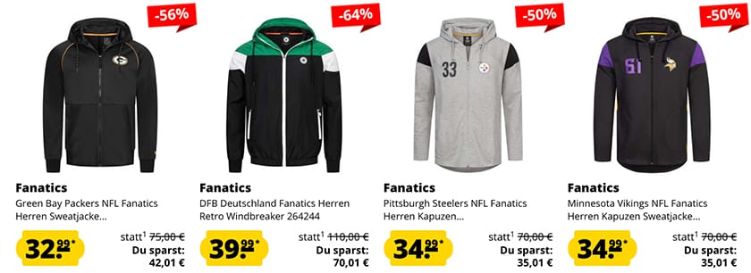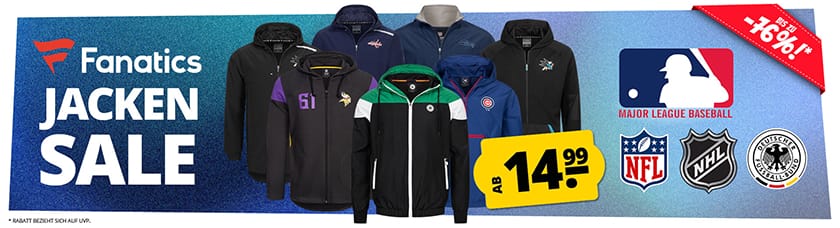 Großer Fanatics NFL, NHL, MLB Fanartikel Sale mit Jacken, Hoodies, Trikots & mehr