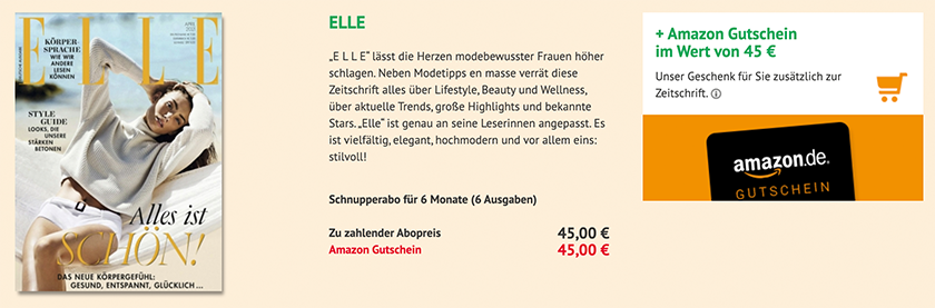 Halbjahresabo (6 Ausgaben) ELLE für 45€ – als Prämie: 45€ Amazon Gutschein