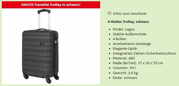 Im Preisvergleich kostet der Travelite Lagos Trolley sonst 59,99€ – daher gebe ich die Ersparnis hier mal mit 35,99€ an.