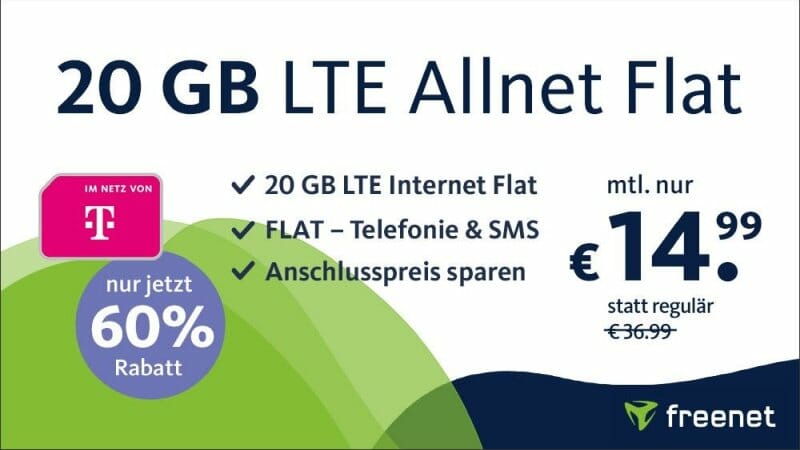Ihr sucht einen Mobilfunktarif mit ordentlich Datenvolumen? Im Telekomnetz? Dann schaut euch mal den folgenden 20 GB LTE Allnet Flat Tarif von Freenet für nur 14,99€ pro Monat an.