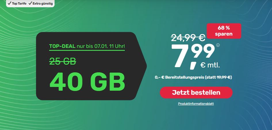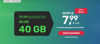 Bei Handyvertrag.de gibt es diese Woche einen echten Knallertarif: Ihr bekommt für kurze Zeit u.a. die LTE Allnet-Flat mit 40 GB Datenvolumen für nur 7,99€ monatlich.