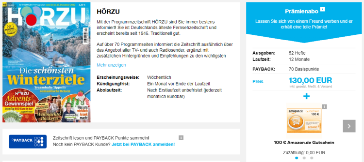 Jahresabo der HÖRZU für 130 Euro und dazu 100,- Euro Amazon Gutschein