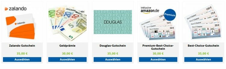 Alternativ könnt ihr auch einen 35,- Euro Zalando Gutschein, einen 35,- Euro Douglas-Gutschein oder einen 30,- Euro Verrechnungsscheck als Prämie wählen.