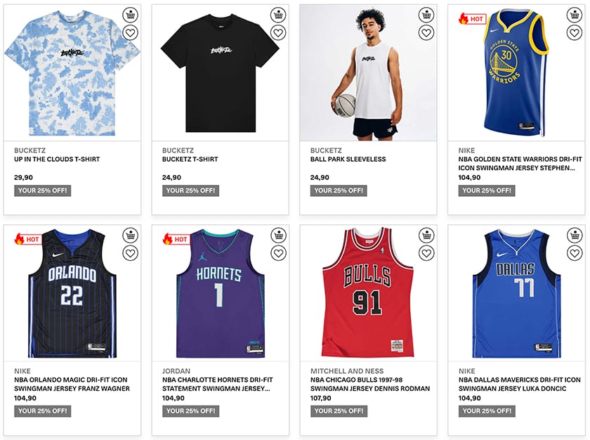 Auf der Aktionsseite findet ihr neben unterschiedlichen Trikots und Hosen auch zahlreiche weitere Bekleidungsartikel, wie z.B. Pullover, T-Shirts, Caps oder Socken aus der gesamten NBA. Insgesamt gibt es über 370 Produkte, sodass sich als Basketball-Fan ein Blick in den Sale auf jeden Fall lohnt.