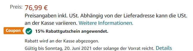 Auf den Preis kommt ihr durch den 15% Rabattcoupon, den ihr auf der Artikelseite aktivieren könnt.