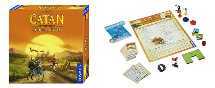 • Das Brettspiel CATAN – Das Spiel wird mit CATAN – Städte und Ritter noch variabler: Neue Spielfiguren und Felder erweitern das Basisspiel um endlose Spielmöglichkeiten – ob nach Vorlage oder eigener Phantasie. Auch kombinierbar mit Seefahrer und Händler und Barbaren