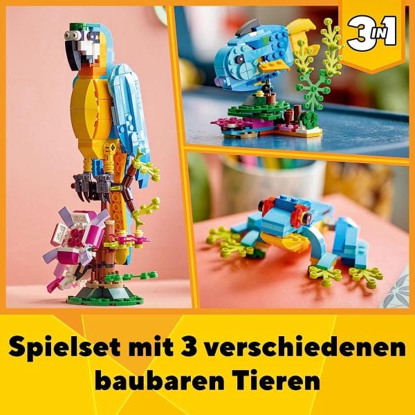 - Enthält 3 Tiere zum Bauen: Papagei, Frosch und Fisch.
