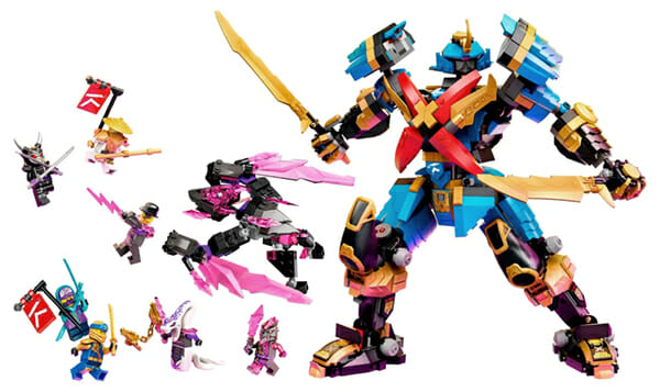 - Mech-Action-Figur mit beweglichen Knien, Armen, Beinen und Hüften; 2 Schwerter; 2 federunterstützte Shooter; und ein Minifiguren-Cockpit. 8 Minifiguren: Samurai X Nya, den Goldenen Jay, Meister Wu, Oni-Garmadon, Lil’ Nelson, General Pythor, den Automechaniker und einen Vergeltungsstein-Krieger.