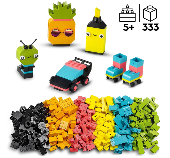 - Dieses LEGO Classic Bausteine-Set enthält 333 LEGO Steine in leuchtenden Neonfarben und verschiedenen Größen sowie lustige Augenelemente