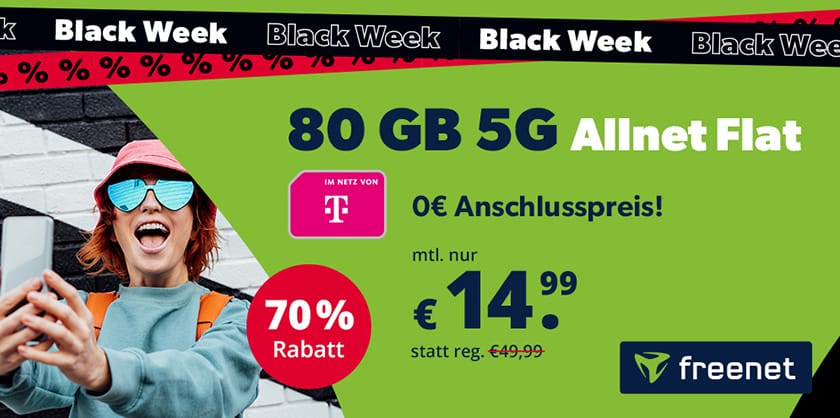 Wem die 35 GB aus dem bisherigen freenet Black Deal nicht ausreichen, bekommt nur noch heute (09.12.2024 – 23:59 Uhr) die freenet 5G Allnet Flat mit satten 80 GB Datenvolumen im Telekom Netz für nur 14,99€ pro Monat.