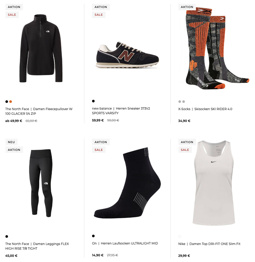 Mit von der Partie sind neben Oberbekleidung und Hosen auch Funktionswäsche und Schuhe für Damen, Herren und Kinder. Zur Auswahl stehen euch auf der Aktionsseite über 5.100 verschiedene Artikel namhafter Hersteller, wie z.B. The North Face, On, Puma, Under Armour, Asics, Columbia oder Mammut.