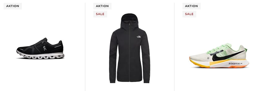 Mit von der Partie sind viele Laufschuhe, Running-Shirts und -Shorts für Damen, Herren und Kinder. Ihr findet jedoch beispielsweise auch eine gute Auswahl an Outdoor-Bekleidung, Bike-Zubehör sowie Hoodies unter den mehr als 2.100 Aktionsartikeln.