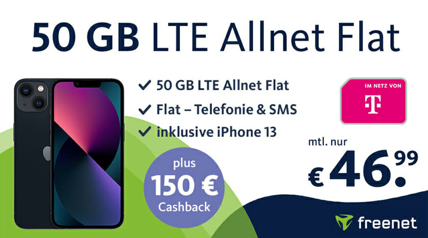 Letzter Tag! freenet Telekom Allnet Flat mit 50 GB für 46,99€ mtl. + Apple iPhone 13 für nur einmalig 10€ + 150€ Cashback