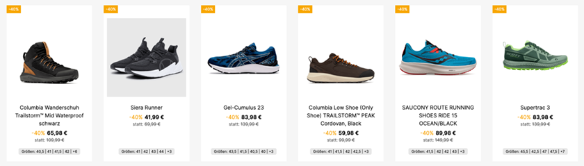 Zur Auswahl stehen euch auf der Aktionsseite über 1.200 reduzierten Produkte beliebter Marken. Mit dabei sind unter anderen Columbia, Nike, Adidas, Saucony uvm.