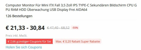 Im Preisvergleich gibt es das 3,5″ AIDA64 USB Typ C IPS Display sonst ab 26,43€ – ihr spart also 5,52€.