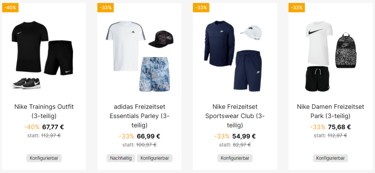 Entdecke eine breite Auswahl an Sommer Sets für Männer, Frauen und Kinder. Von lässigen Alltagsoutfits bis hin zu sportlicher Kleidung – für jeden Geschmack ist etwas dabei. Namhafte Marken wie Nike, adidas und Under Armour bieten nicht nur ansprechendes Design, sondern auch erstklassige Qualität und Tragekomfort. Wähle aus verschiedenen Farben und Größen und genieße den Sommer in deinem perfekten Outfit.