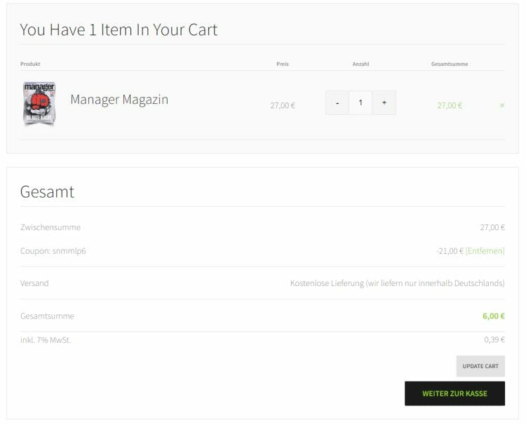 Das sieht dann nach Eingabe des Gutscheins im Warenkorb so aus: