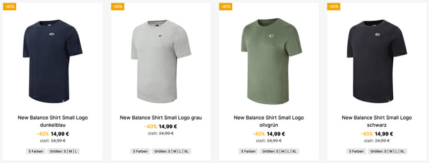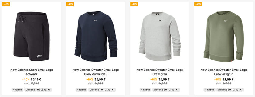 Zur Auswahl stehen euch auf der Angebotsseite Sweater, Jogginghosen, Shorts, Hoodies, Sweatjacken und T-Shirts – allesamt mit dem kleinen New Balance Logo drauf. Diese wiederum gibt es jeweils in bis zu 5 verschiedenen Farben (Weiß, Grau, Dunkelblau, Olivgrün und Schwarz) und je Modell in den Größen S bis XXL.