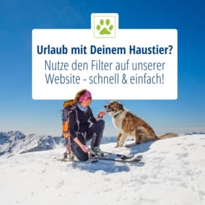 Nachdem ihr eine erste Suche mit den Kriterien (Reiseziel | Personen | Zeitraum & Dauer) abgesendet habt, öffnen sich auf der linken Seite die Filtermöglichkeiten für euren Urlaub. Diese ermöglichen euch unter dem Punkt „Ausstattung der Unterkunft“ den Filter „Haustiere möglich“ zu setzen. Die Ergebnisliste zeigt dann nur Unterkünfte an, bei denen grundsätzlich die Mitnahme des Tieres möglich ist.